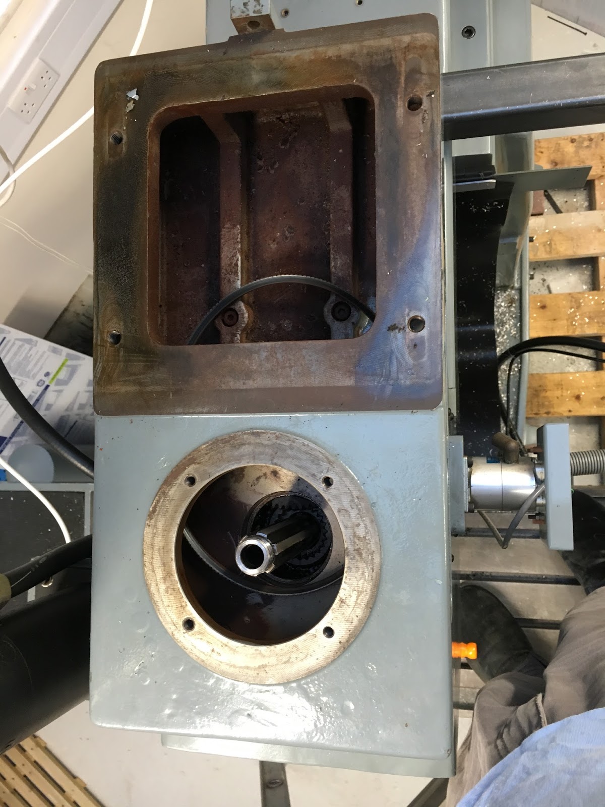 The pulley housing was fastened to the head by 6 bolts from inside. But even when I'd finally managed to extract them, there was a spacer piece between the housing and the head, holding the housing in place. God knows why that is fitted. It's only a 3kW motor, so the forces involved are pretty modest. The spacer is hollow and held to the head by 4 awkward bolts and the housing by another 4 awkward bolts. I managed 6 of them but the final 2 (the furthest bolts into the head) were not going to happen. It wasn't helped by some fat clot fitting a large box section in front of the opening: